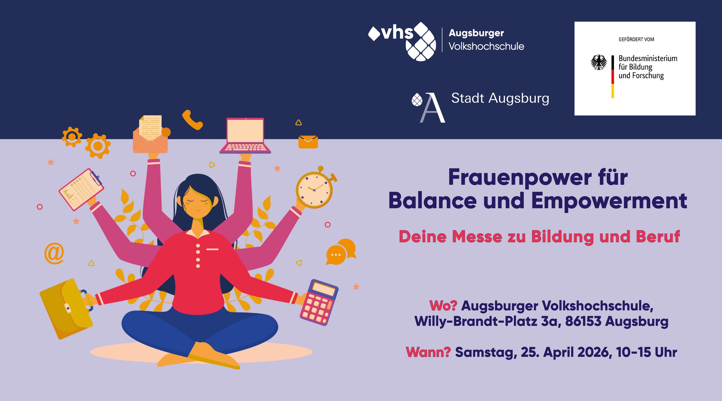 Am Samstag, den 25. April 2026, von 10:00 bis 15:00 Uhr, laden die Stadt Augsburg und die Augsburger vhs zur zweiten Frauenberufsmesse in die Volkshochschule am Willy-Brandt-Platz 3a ein. Unter dem Motto „Balance und Empowerment für Frauen – Deine Messe zu Bildung und Beruf“ bietet die Messe Frauen in allen Lebensphasen Inspiration, Beratung, Networking sowie ein vielfältiges Programm aus Workshops und Vorträgen – inklusive Kinderbetreuung.
