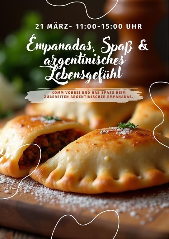 In diesem Workshop bereiten wir gemeinsam argentinische Empanadas zu sowie einige Saucen, die sowohl zu den Fleisch- als auch zu den vegetarischen Empanadas hervorragend passen. Komm vorbei und verbringe eine angenehme Zeit, in der du Spanisch übst und eines der traditionellen Gerichte Argentiniens kennenlernst.